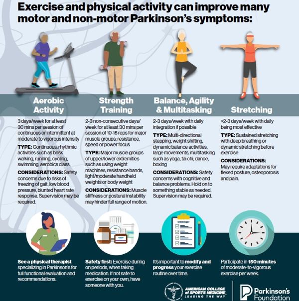 MJ Fox produced an extensive guide to exercise and parkinson’s in January 2024- link to download The chart below on how much exercise you should do comes from their guide